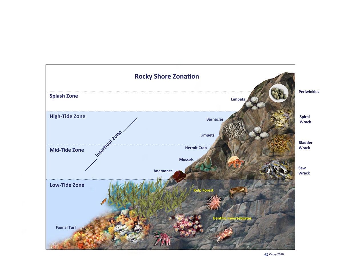The rocky reefs along the Berwickshire and Northumberland coast provide some of the most diverse habitats in the North Sea. They encompass a wide variety of shapes and forms, providing a solid foundation for seaweeds and marine life to colonise. The daily tides create challenging conditions. Plants and animals are faced with drying out as the tide falls, predation by shore birds as they are exposed, changes in temperature and altered salinity levels due to rain water dilution or evaporation from the sun. As the tide returns, crashing waves and swirling currents create stormy conditions for marine life, who must then survive underwater until the tide falls again. A typical rocky shore is occupied by an astonishing variety of species and can be split into zones. Areas at the top of the shore are exposed for much longer periods compared to areas of the lower shore and this creates different environmental conditions, with different habitats supporting specific plants and animals who have adapted their body structure to survive life on the rocky shore.